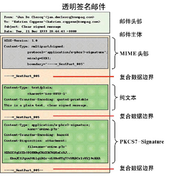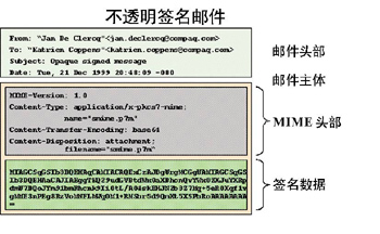 ---- 如表1所示,用户可以使用application/pkcs7-MIME数据类型或multipart/signed和 application/pkcs7- signature等复合数据类型标记邮件的邮件主体。每个应用执行不同的签名类型:透明的(clear)和不透明的(opaque)。这两种签名类型可以在S/MIME和非S/MIME邮件客户端之间交换已签名的邮件。透明签名的邮件把数字签名同已签名的数据区分开来,不透明的签名邮件将签名和信息绑定在同一个二进制文件中。图1显示了透明签名的邮件格式,图2显示了不透明签名的邮件格式。