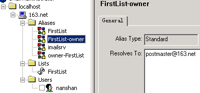 3、与此同时,系统还会自动在“Aliases”(别名)中,建立“imailsrv”、“FirstList”、“FirstList-owner”及“owner-FirstList”四个别名。如下图所示: