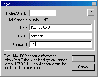 3、工具调用:运行“IRAdmin.exe”,在“Host”处输入邮件主机的域名(或IP地址),在“UserID”处输入邮件用户名,在“Password”处输入密码,再按“OK”,即可进入“IMail Remote Manager”(IMail管理工具)的主窗口。