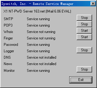 ⑶管理邮件主机服务:选工具栏的“Services”(或“File”菜单中的“Services”),再根据需要“Stop”(停止)或“Start”(开启)相应的服务,最后按“Exit”退出。