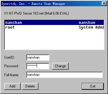 ③如欲修改用户密码,则在列表中选中它,在“Password”栏输入新密码,再按“Change”即可。