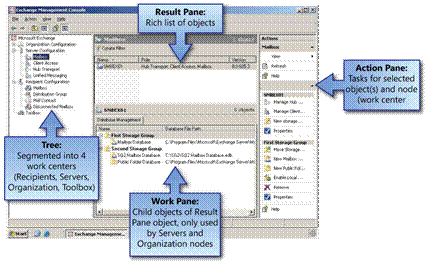 如下图所示,Exchange 管理控制台分为4个部分:控制台树,结果面板,操作面板和动作面板。多面板的显示方式降低了导航的混乱,一眼看去可以获得更多信息。