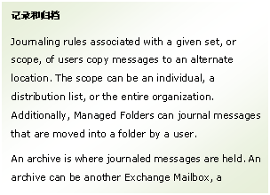 Exchange Server 2007记录的邮件可以保存在Exchange数据库中,SharePoint站点或者可以发送到任何由第三方邮件记录公司使用的外部SMTP地址。