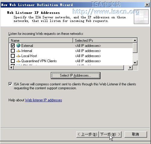 在Web侦听器IP地址页,勾选外部网络,你也可以点击选择IP地址按钮来配置Web侦听器侦听的IP地址,点击下一步;