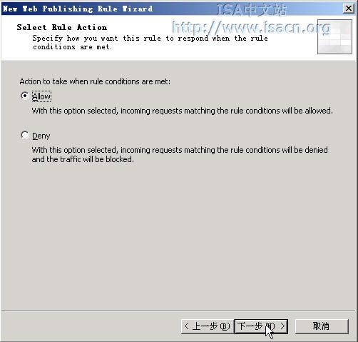 需要注意的是,由于在进行Web发布时,ISA需要占用TCP/IP上的相应端口,因此Web发布规则所侦听的端口如TCP 80需要保证没有被其他应用程序所占用,这个可以通过netstat -b find ":80"来观察。