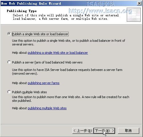 在指定服务器场页,你可以选择 ISA Server 2006 对入站Web请求的负载均衡方式,它们主要是针对故障恢复的场景,ISA Server 2006 中具有以下两种负载均衡模式: