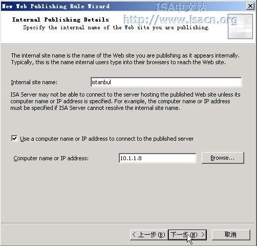 在内部发布细节第一页,在内部站点名栏输入被发布的内部Web站点的名称(Web站点的主机名头),但是由于存在Web站点的主机名头和计算机名不一致的现象,为了便于ISA连接到内部的Web服务器,建议你勾选使用计算机名或IP地址来连接到被发布的服务器,然后输入服务器的IP地址,从而避免ISA不能正常解析内部Web站点名从而导致无法连接的现象,完成后点击下一步;