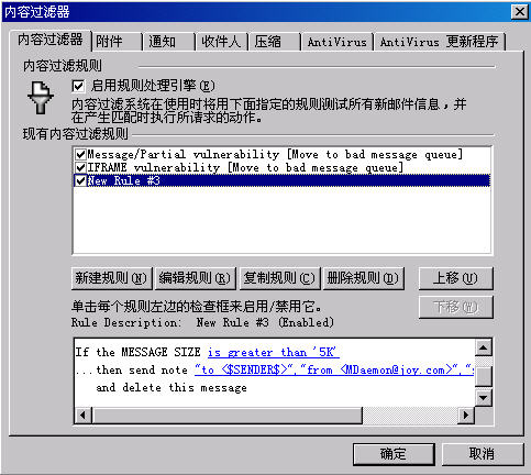 2)限制邮件大小,“安全”-“内容过滤器”-“内容过滤器”-“新建规则”