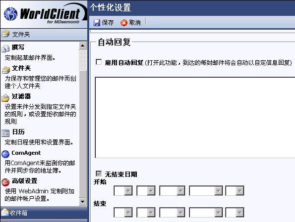 MDaemon支持多种语言的Web页面显示,无论安装英文版本或者中文版本的MDaemon,其用户使用的Web登录邮箱都可以使用中文显示。