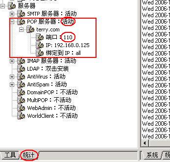 打开MDaemon主程序界面,在左侧下方的“统计”栏中找到“服务器”,点击“POP服务器”左侧的“+”,打开POP服务的状态: