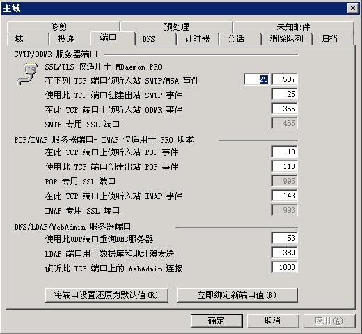 如果POP端口被更改为非110端口,则可以在MDaemon主界面选择“设置菜单”→“主域”→“端口”来更改,默认的端口设置如下: