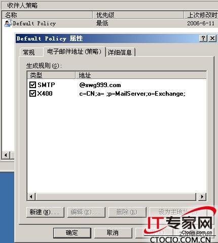 图中的规则中的"SMTP"为"xwg999.com",这是我们的默认规则,也就是说,在域中每增加一个用户,如果不作特殊的设置,那么他的电子邮箱的后缀名为"@xwg999.com"。为了添加其他的域名,我们就要把其他的域名要添加到此"收件人策略"窗口中来。具体步骤如下: