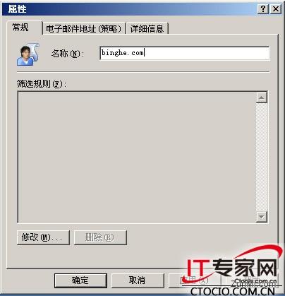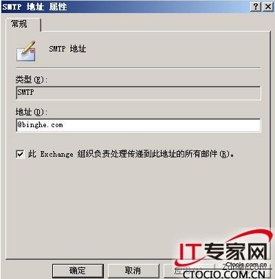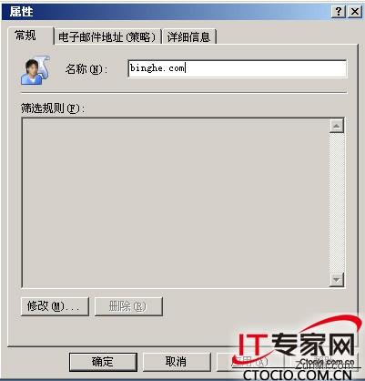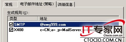 这样就建立了一个"收件人策略",右击此新建的"收件人策略",选择属性,再选择"电子邮件地址(策略)"选项卡,发现规则中的"SMTP"还是默认的"xwg999.com",不是我们期望的"binghe.com",如下图10所示: