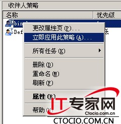 最后在新建立的"收件人策略"中,右击选择刚才建立的收件人策略,在弹出的菜单中选择"立即应用此策略"就可以马上启用以此域名为后缀的电子邮件地址了。如下图12所示:
