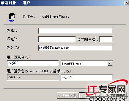现在就为刚建立的域名建立用户邮箱,在"Active Directory用户和计算机"新建用户,如下图13所示: