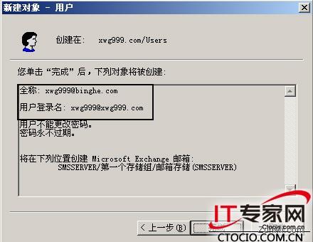 此时就要注意了,在"用户"文本框中输入的是用户的邮箱的全名,如上图中的"xwg999@binghe.com",在"用户登录名"中还是采用的是用户名,而不是全名,点击下一布步就可以了,按照正常的方式为用户设置其他的选项,最后显示如下图14所示: