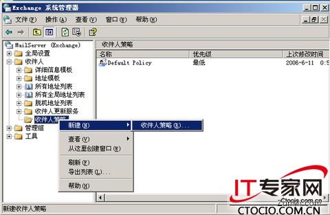 右击"收件人策略"选项,在弹出的菜单中选择"新建",在直接选择"收件人策略",如图2: