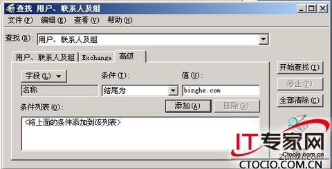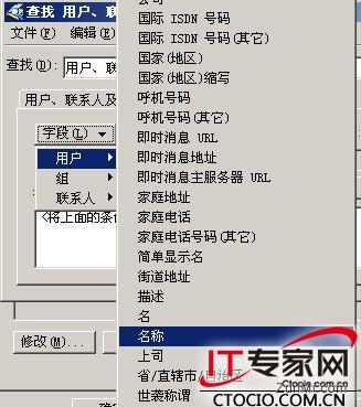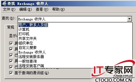 然后在点击"修改"按钮,在弹出的"查找Exchange收件人"对话框中的"查找"列表中选择"用户、联系人及组",如下图6所示: