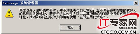 单击确定返回"Exchange系统管理器"窗口,接着会出现"Exchange系统管理器"对话框,点击"确定"按钮就可以了,如下图9所示: