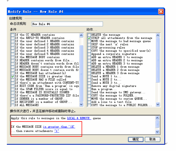 选择条件 if the message size is greater that,动作选择 strip all attachments from the message。点蓝色链接处可以设置大小,为了方便测试,我设置了1k。