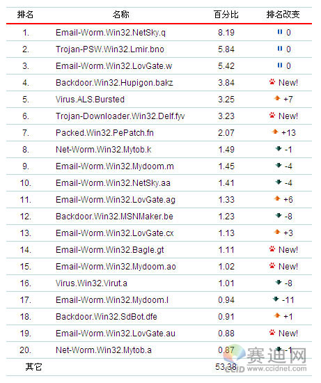 【赛迪网-IT技术报道】 三月份报告与二月份报告有类似的地方,即排名前“三甲”的恶意程序依然是:第一位的Email-Worm.Win32.NetSky.q,占8.19% .第二位的Trojan-PSW.Win32.Lmir.bno,占5.84%,第三位的Email-Worm.Win32.LovGate.w,占5.42%。但是值得注意的是排名第二位和第三位的恶意程序与第一位之间的差距已经从20个百分点缩短到几个百分点了,蔓延态势不容乐观。